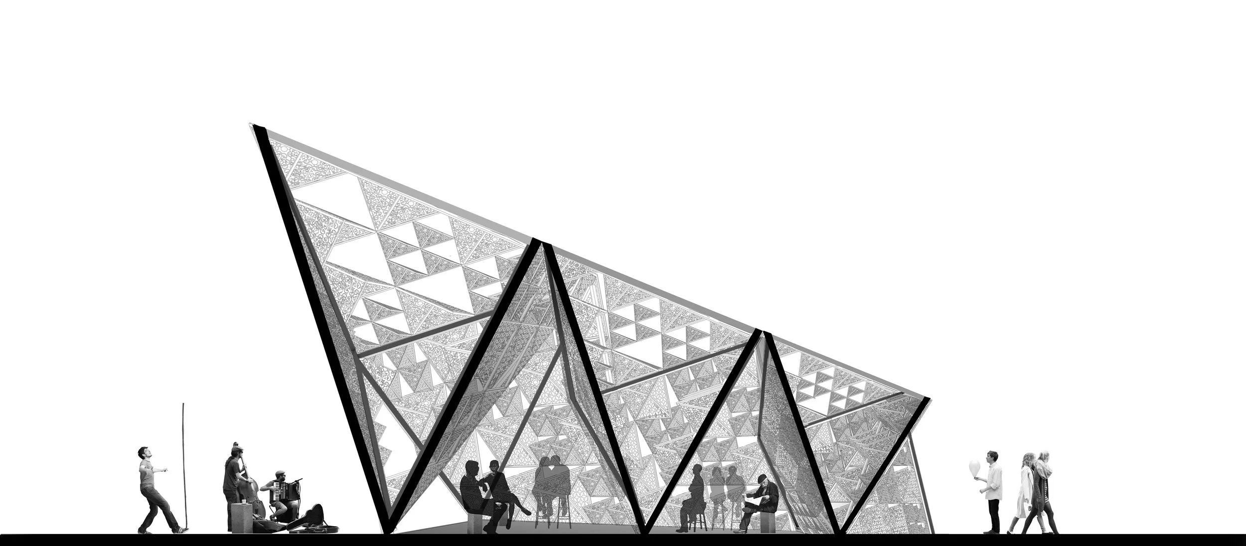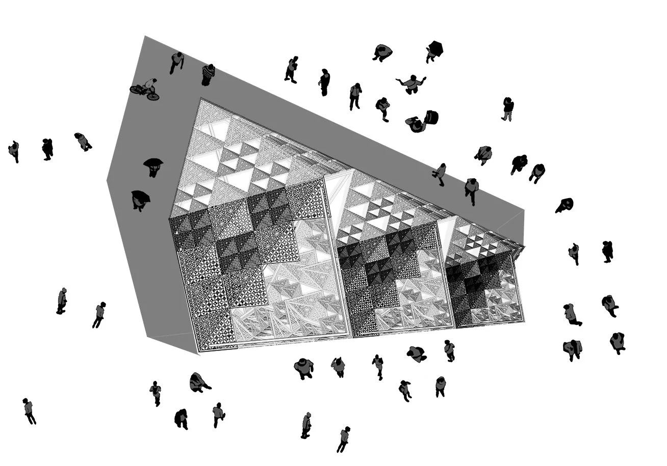 A public fractalized triangular structure based on a series of pods that retain its scale organically. The Pavilion integrates to its environment through angular niches that frame views from historical buildings, and allows access to users by creating a semi-open walkable space. From pop-up shops to performance and art exhibits, the structure operates with an open agenda as a versatile living space.