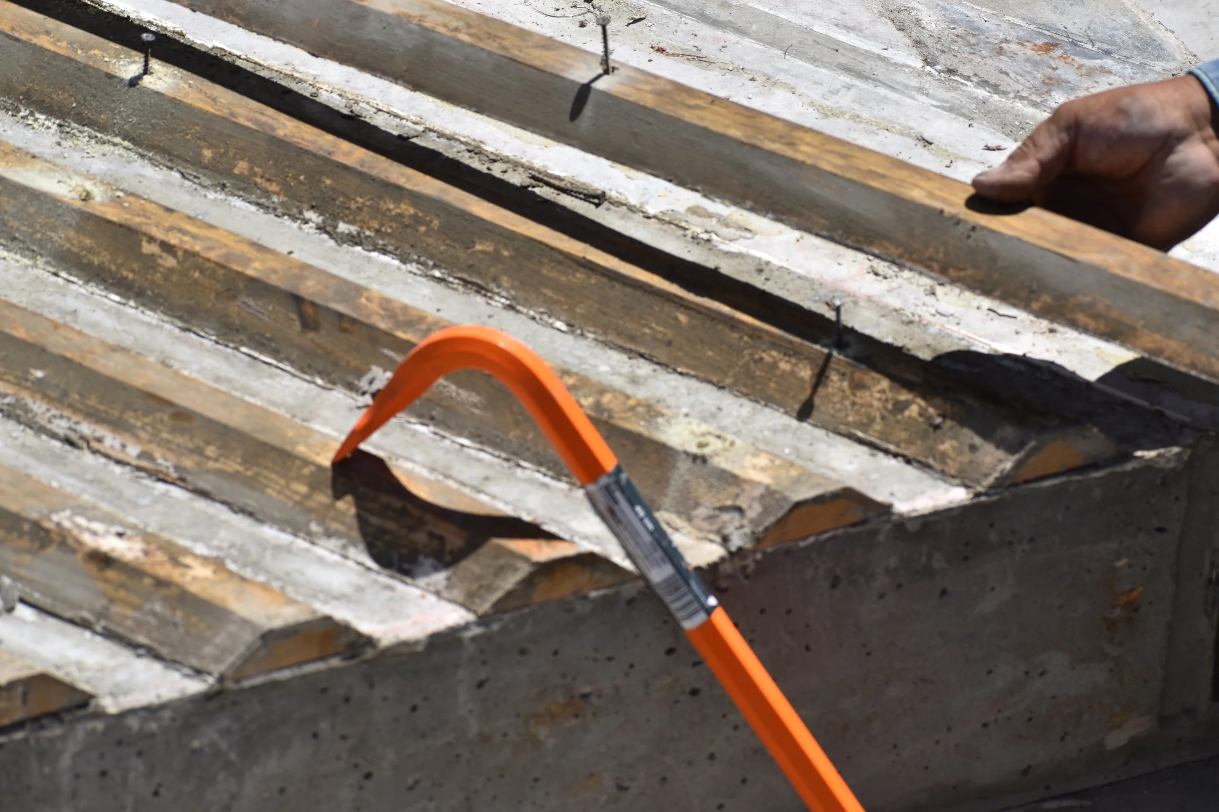 This mobile screen is made out of the scrap wood from our Tres Torres concrete building. The sculptural shape is inspired by the columns and pattern of the building. It was assembled with steel cable and hinges, which keeps it floating in place and moving ever so slightly.